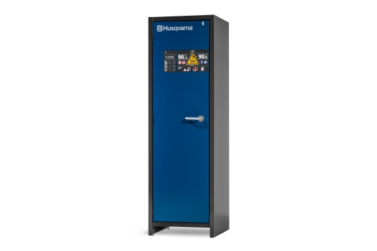 Husqvarnas batteriladdningsskåp M är konstruerat för säker och godkänd förvaring och laddning av litiumjonbatterier. Detta endörrars 400V-skåp erbjuder 90 minuters brandmotstånd från utsidan in och inifrån och ut*. Utrustad med en rökdetektor som ger tidig upptäckt av begynnande bränder och ett larmsystem som säkerställer att larm på plats skickas omgående. Grenuttag och hyllor ingår. - *Enligt EN-14470-1 och EN-13631