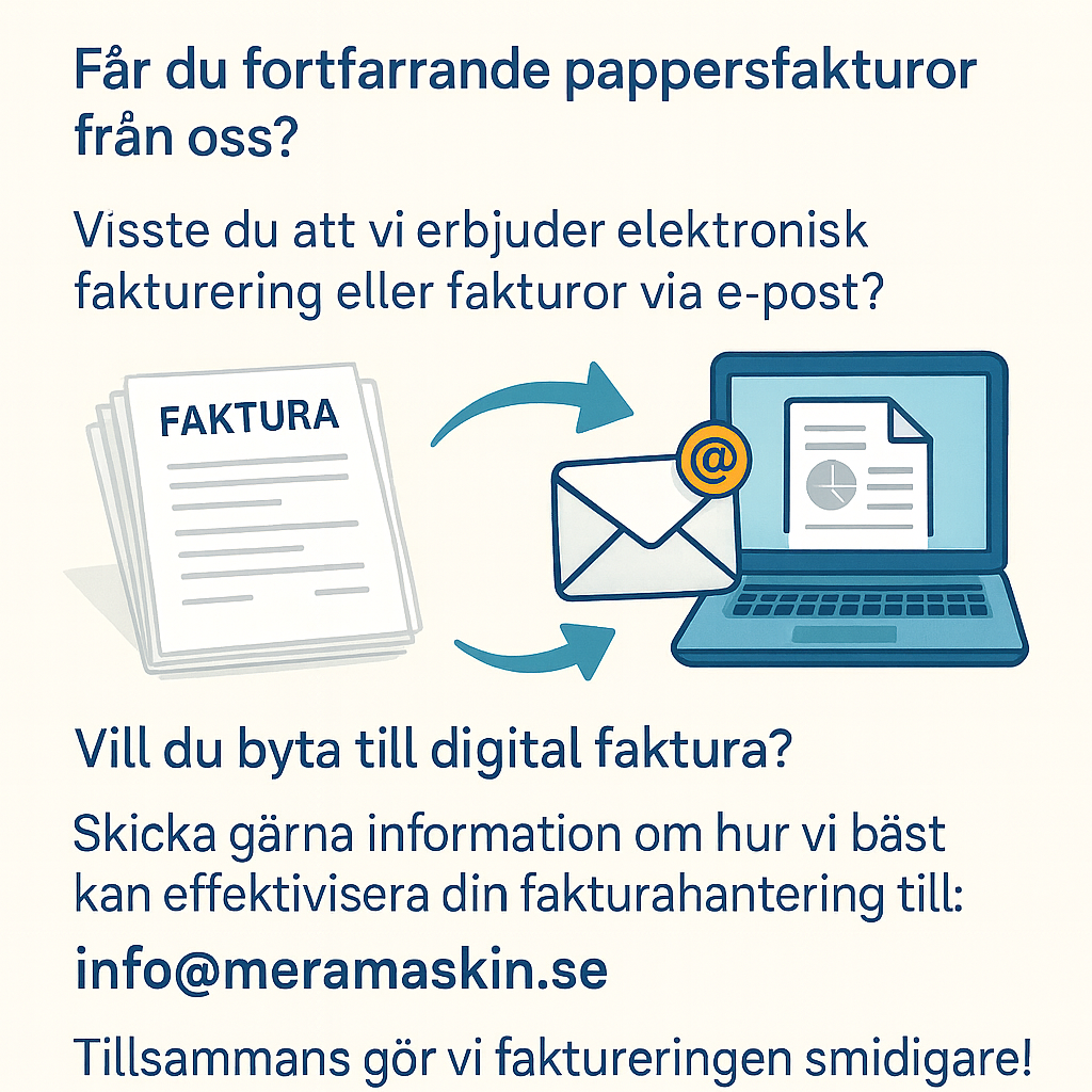 Skicka gärna information om hur vi bäst kan effektivisera din fakturahantering till: info@meramaskin.se